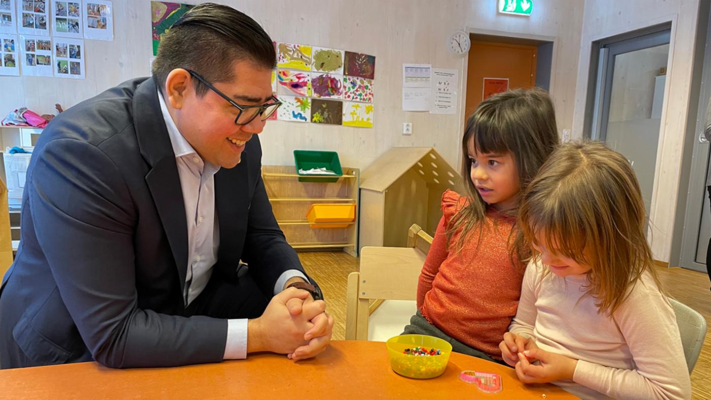 Byråden forstår kva styraren snakkar om. Kona hans arbeider i barnehage, og dei tre barna deira har gått i barnehage i Bergen. Sjølv har han eksamen i barne- og ungdomarbeidarfaget frå heimlandet Finland.