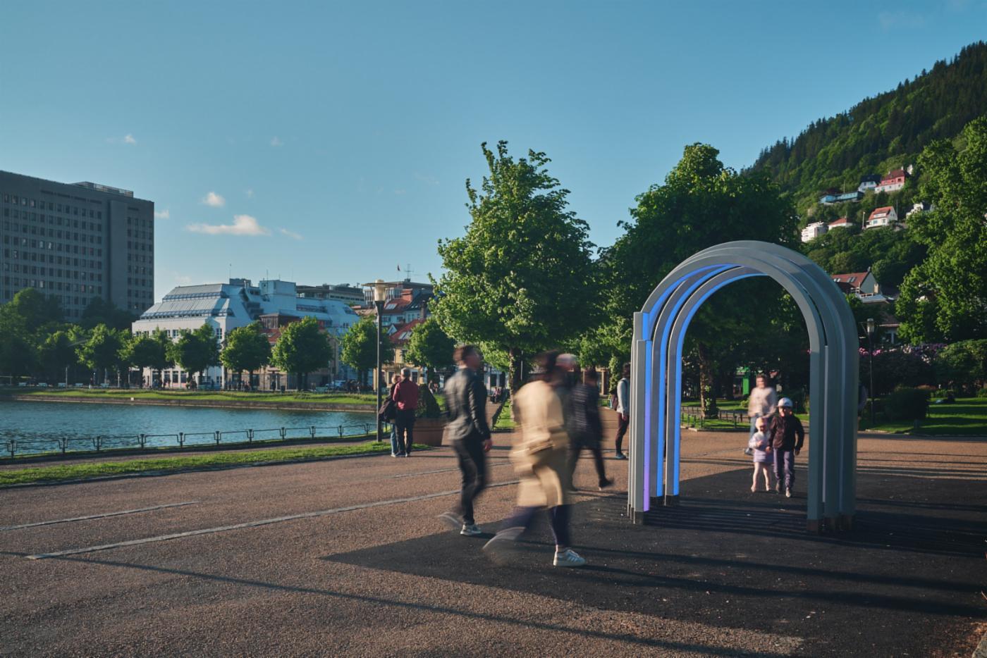 - Byge er en installasjon som visualiserer været i sanntid med nedbørsmengde, temperatur og vindstyrke. Installasjonen er en omsluttende og sanselig tolkning av været, og den endrer humør i takt med dette. Installasjonen består av 5 buer og 4 stolper, og er utformet med et ønske om at publikum skal gå gjennom og interagere med installasjonen.