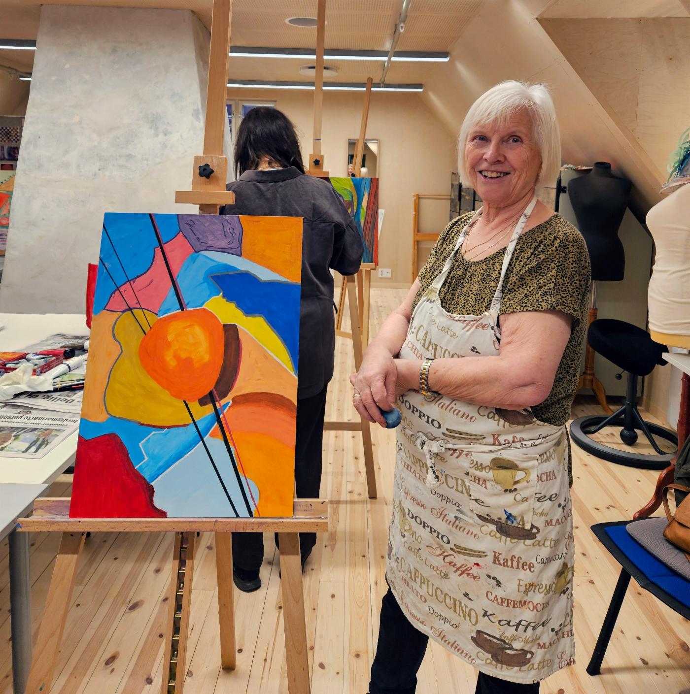 Eli forteller at hun de siste ukene har vært vikar på Birgiths onsdags-malegrupper, og at hun selv arrangerer malekurs på mandager – dette er et kurs i regi av Hieronymus. Selv om Eli egentlig er gått av med pensjon, er hun fortsatt en stor ressurs for kulturkontoret og en dyktig og inspirerende instruktør for maleglade. Dette semestret er kun damer påmeldt kursene, men menn kan selvsagt også melde seg!