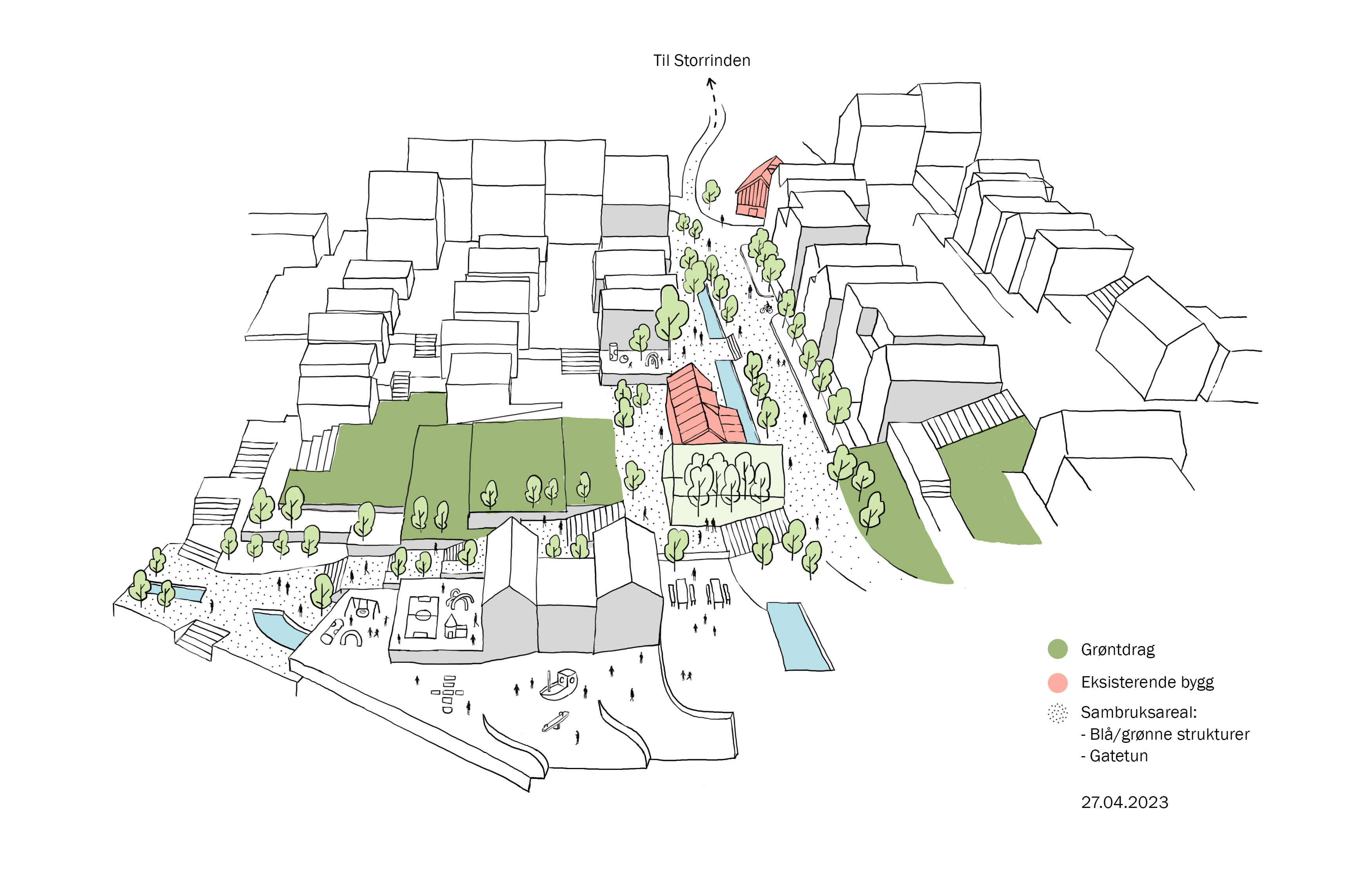 Hovedformålet er boligbebyggelse. Det planlegges for inntil 210 boliger, herunder noen kommunale utleieboliger. Det foreslås i hovedsak blokker og rekkehus med tilhørende parkeringsanlegg under bakken, uteoppholdsarealer, lekeplasser og tverrforbindelser.