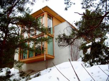 Volumene tegner opp særtrekkene i terrenget. Hovedformen er langstrakt og utført i tre, mens murene danner en lavere del tverrstilt på hoveddelen. Murene tilpasser seg terrenget, det virker som om de gror opp av bergflatene. Furuskogen står tett inn til huset og lyng og berg danner terrenget på tomten.