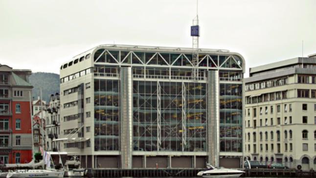 Politihuset ble tegnet i 1965 av Aall-Løkeland-Ragde og utvidelsen 1994 av Helge Hjertholm fikk Bergen kommunes arkitekturpris i 1994.