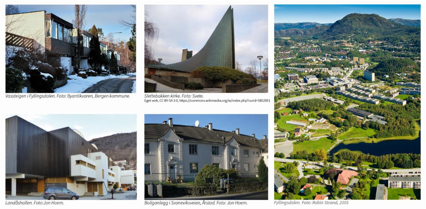Arkitekturen har satt sitt preg også utenfor sentrum. Arna eller Åsane, Nordnes eller Fyllingsdalen, Fana eller Årstad – Bergen er sammensatt av nabolag, strøk og bydeler som alle har sin særegne identitet. Disse har sine egne bymiljøer, landskap og bebyggelsesstruktur, en lokal egenart som skal være utgangspunkt for utvikling og fortetting.