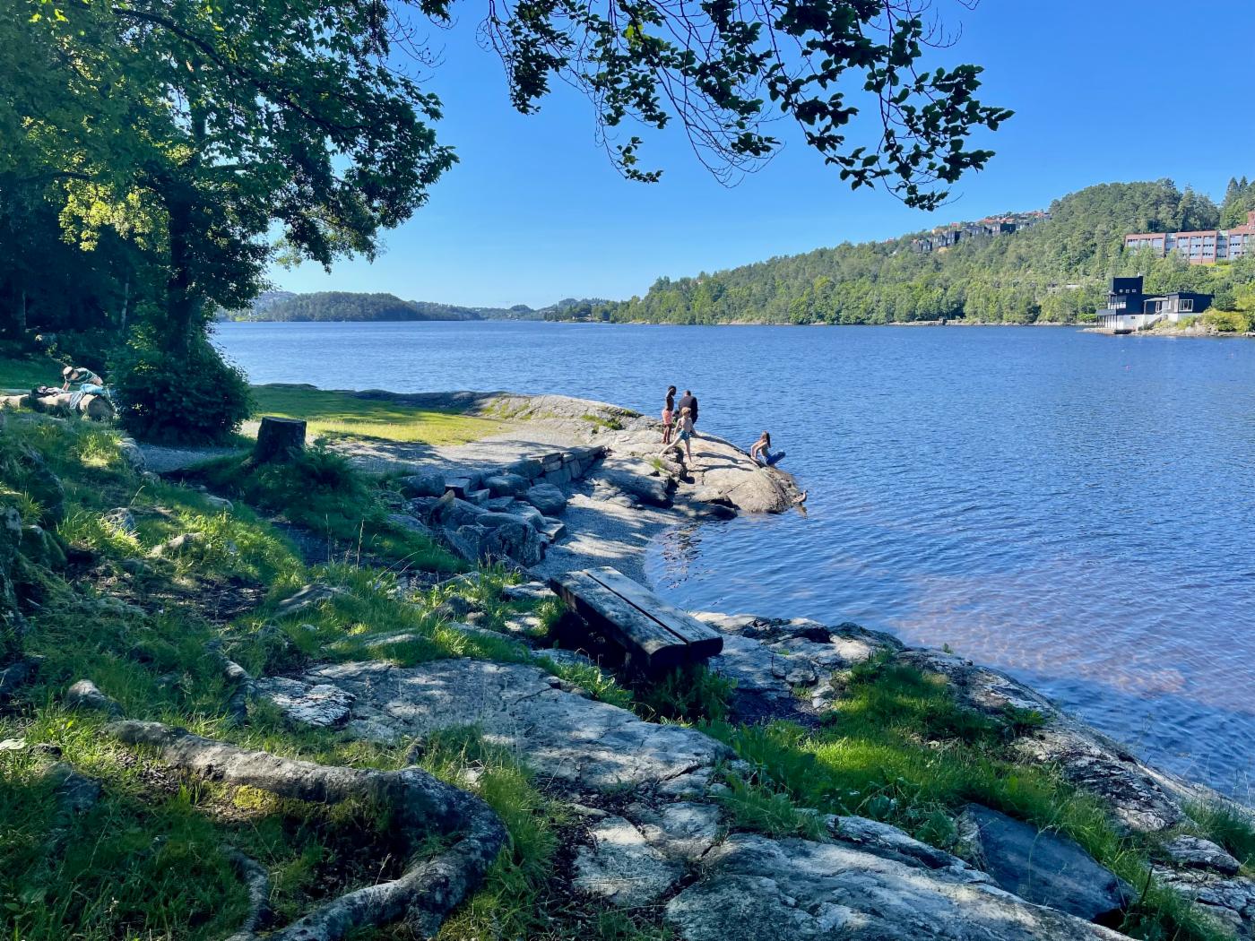 I rojale omgivelser, nederst i hagen på Gamlehaugen, ligger det et lunt badeområde, med flytebrygge og stupebrett i sommersesongen. Tilkomst til vannet via strand og svaberg.