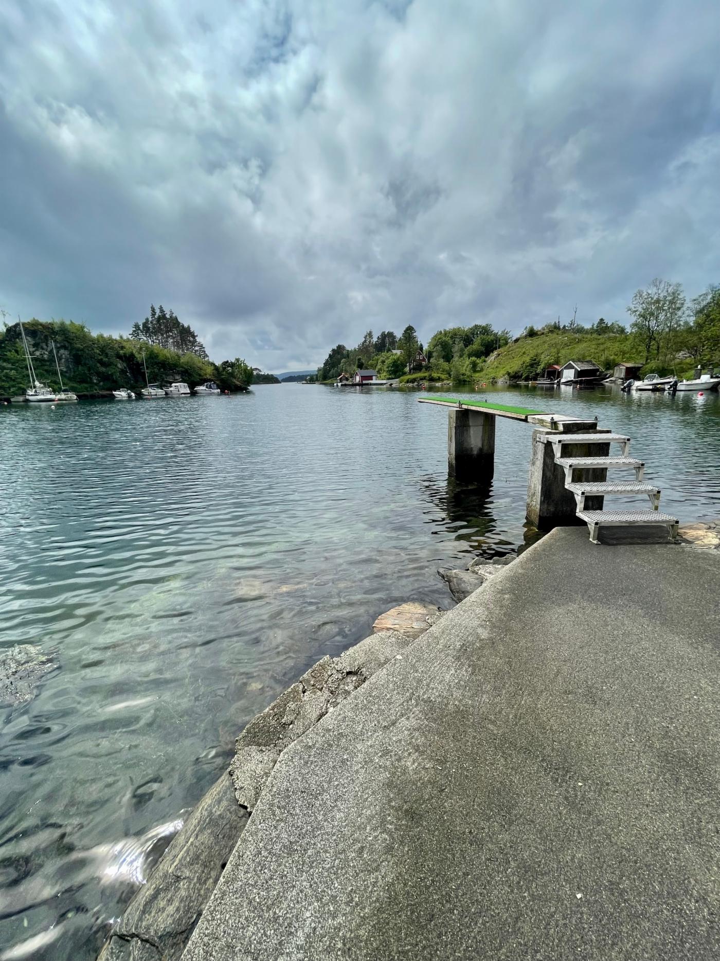Stort og lunt badeområde med svaberg og stupebrett. Ikke barnevennlig.