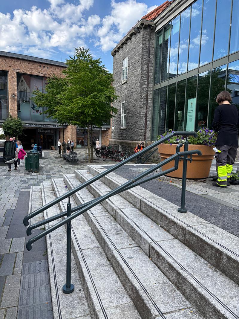 Trapper med håndløpere er lagt inn for å ta opp høydeforskjeller, stramme opp plassen, og gir retning. Trappene bidrar også til å gi plassen en bedre funksjon og oppdeling.