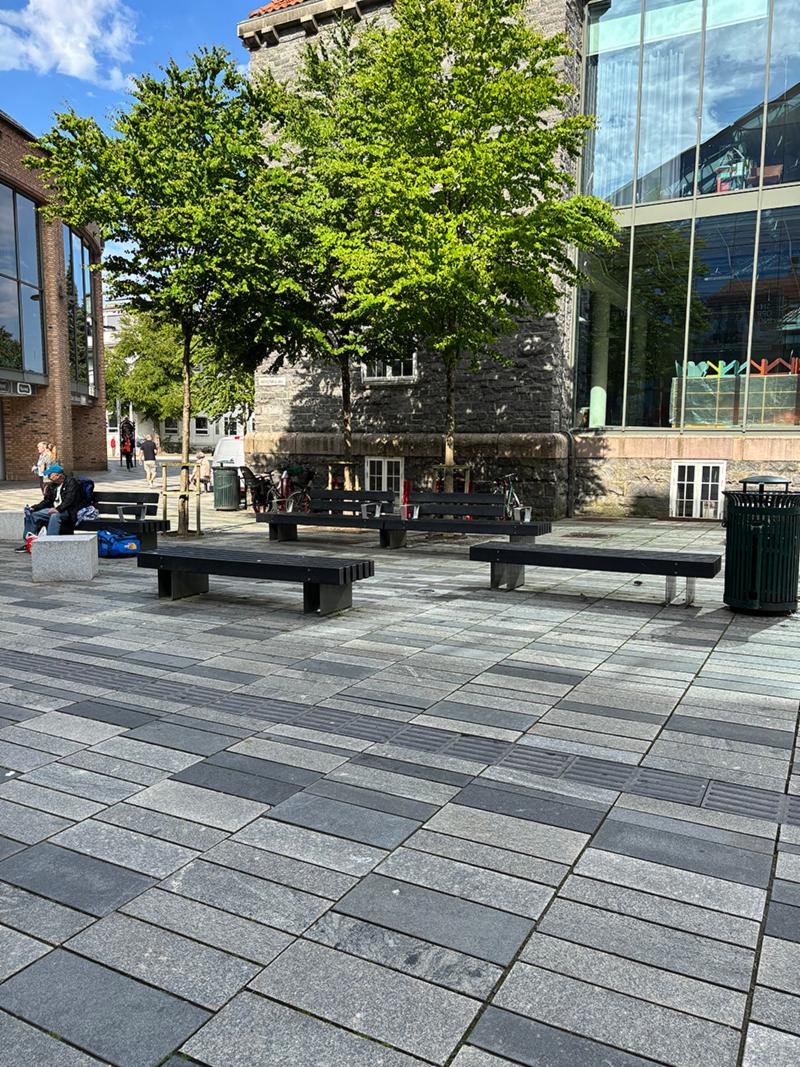 Blomster i urner og universelt utformede benker er satt opp slik at det er tilrettelagt for opphold, nyte solen på de dagene den skinner, og for å slappe av og lese.