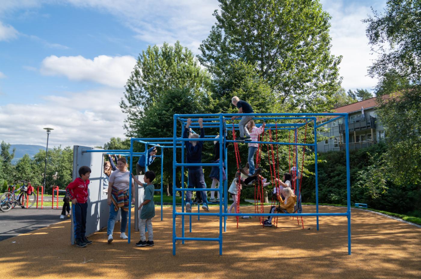 Det finnes mange muligheter for klatring i parken. I bakgrunnen skimter du sykkelparkering.