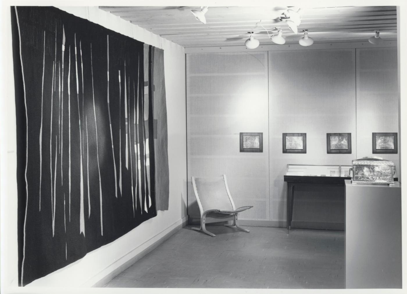 Billedveven «Vår» av Synnøve Aurdal, en gave fra Oslo by, til venstre, og stemmeurne i sølv, en gave fra næringslivsorganisasjonene i Bergen til høyre. Fotograf Jan H. Reimers, 1970. Arkivet etter Byjubileumskomiteen.