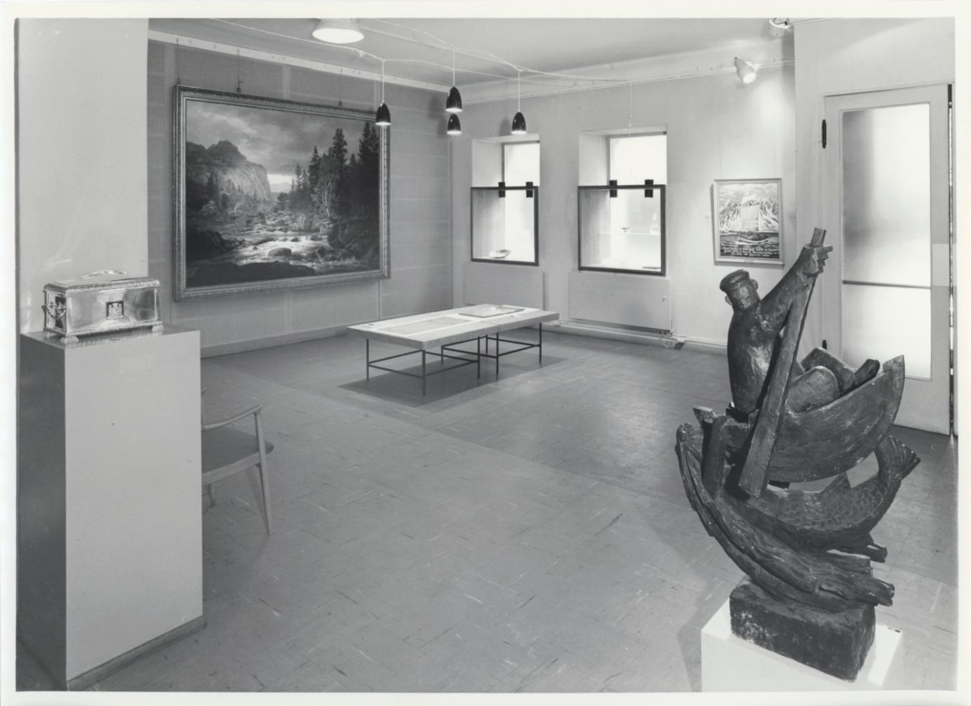 Stemmeurne i sølv fra handels- og industriorganisasjonene i Bergen, fonteneskulpturen Fiskeren av billedhuggeren Arne Johan Vinje Gunnerud, gave fra Fana, Åsane, Arna og Laksevåg kommune og landskapsmaleri av J.C. Dahl, gave fra Bergens rederiforening. Fotograf Jan H. Reimers, 1970. Arkivet etter Byjubileumskomiteen.