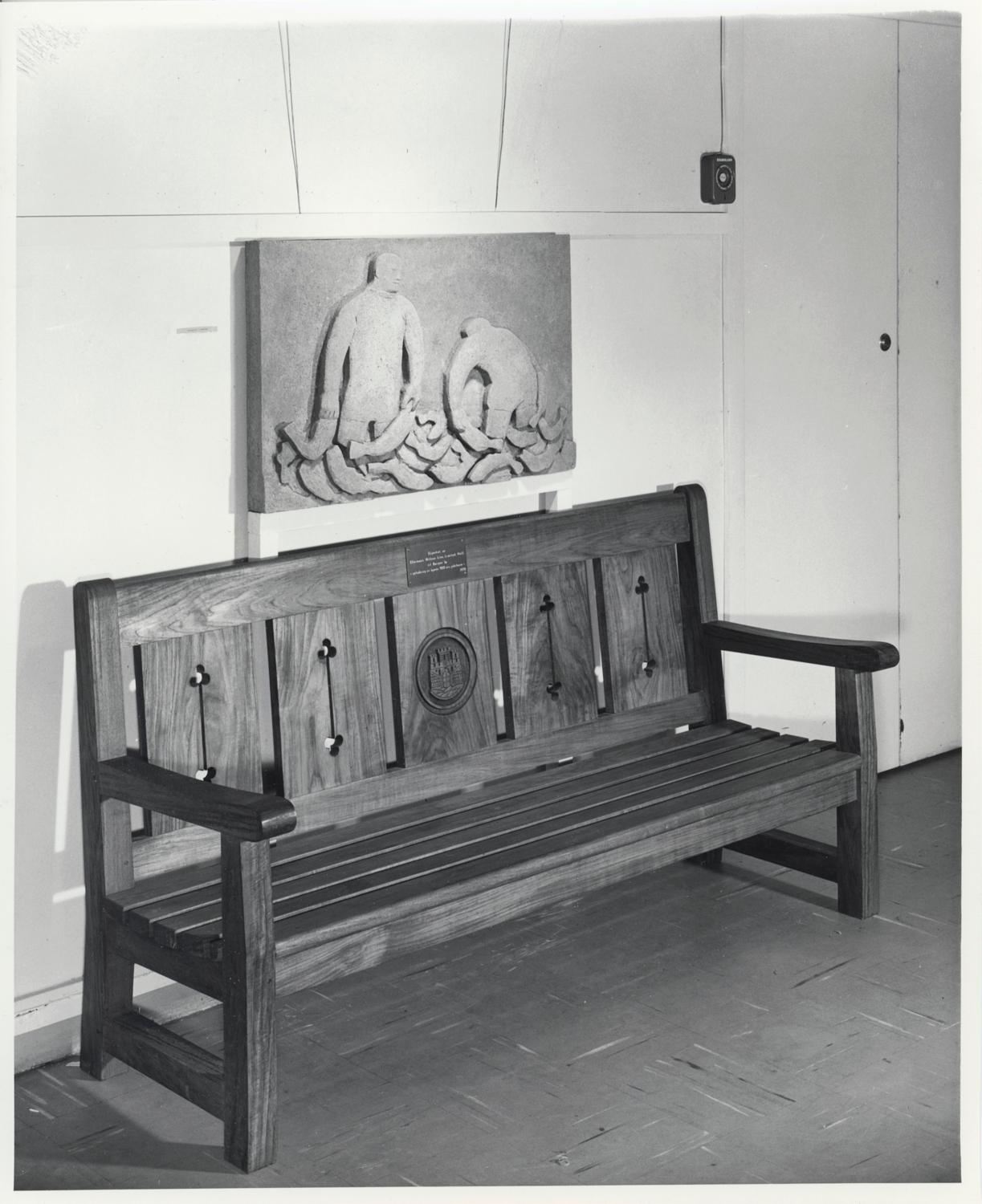 Stenrelieffet var en gave fra Reykjavik, mens den flotte benken var en gave fra rederiet Ellerman’s Wilson Line Ltd. i Hull. Fotograf Jan H. Reimers, 1970. Arkivet etter Byjubileumskomiteen.