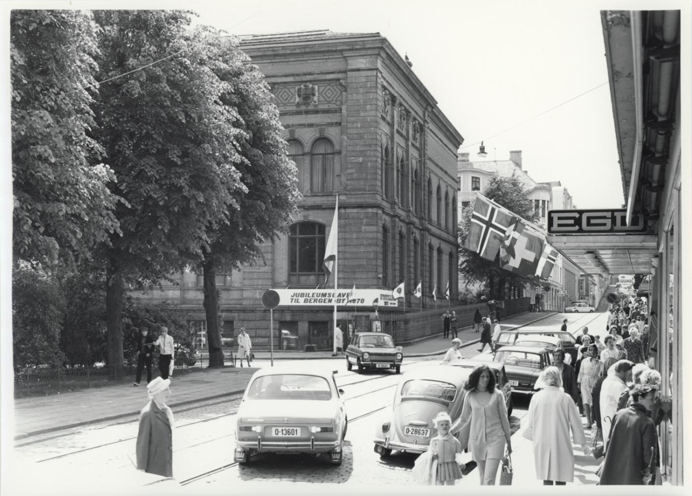 Folkeliv i Olav Kyrres gate utenfor utstillingen i Kunstindustrimuseet. Fotograf Jan H. Reimers, 1970. Arkivet etter Byjubileumskomiteen.