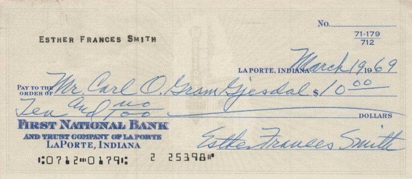 Sjekk på 10 $ fra Esther Frances Smith i La Porte, Indiana. Hun hadde en mormor fra Bergen, hadde vært på bankett med kong Olav da han var i Seattle, og foreslo at hele USA skulle tenne lys for Bergen 365 dager i jubileumsåret. Korrespondanse i arkivet etter byjubileumskomiteen.