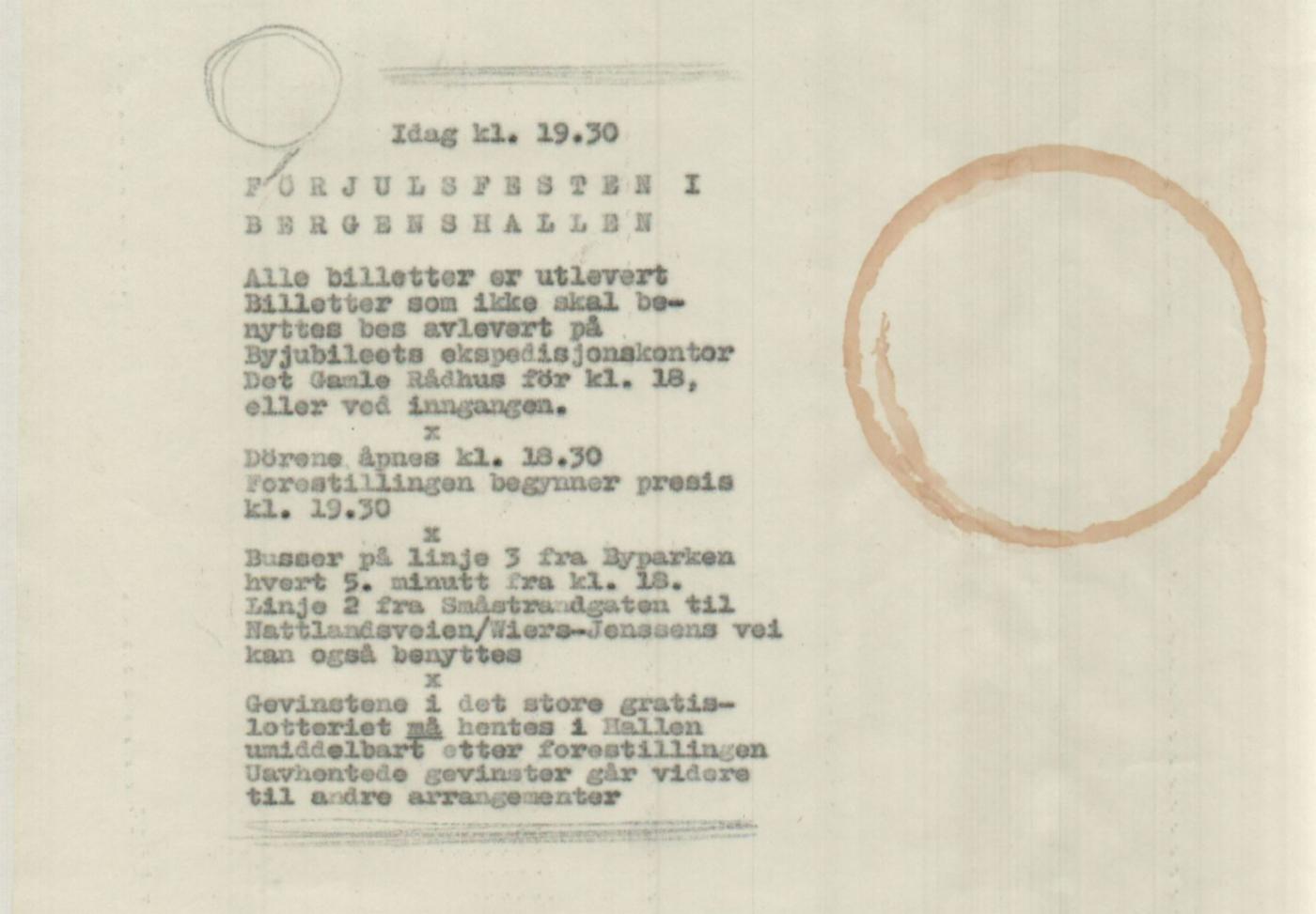 I desember skulle det festes. Tusen pensjonister fikk feire adventstiden med forfriskninger og underholdning i byens eldste festlokale, Håkonshallen. Men toppen av kaken var naturligvis en gratis førjulsfest for fem tusen bergensere i byens yngste festlokale, Bergenshallen, mandag den 7. desember. Det skulle bli en familiebegivenhet med et så mektig program at alle generasjoner, fra 9 til 90 år, ville finne noe å fryde seg over.