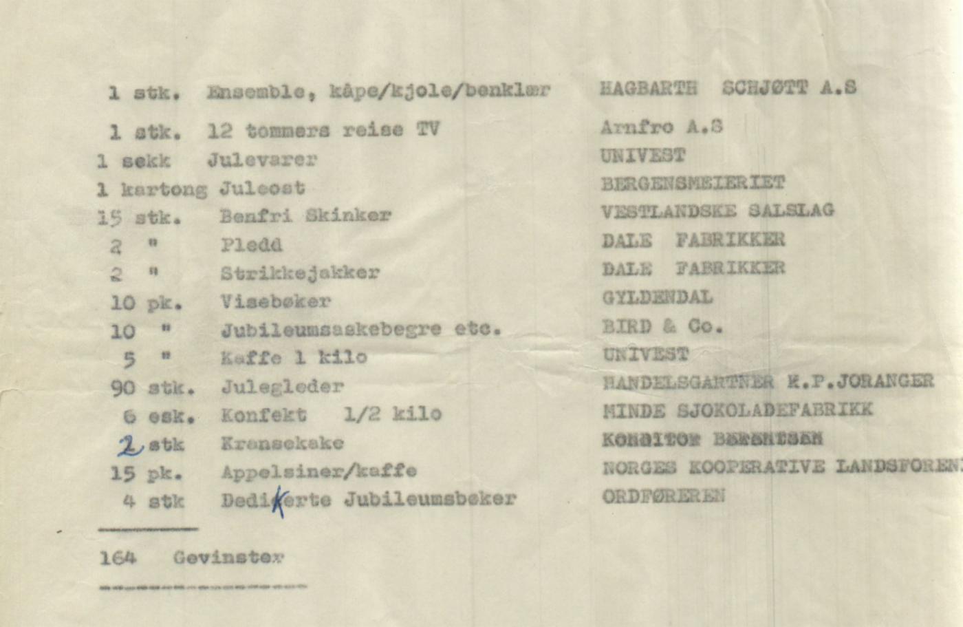 I god bergenstradisjon var en av hovedattraksjonene for kvelden et gedigent lotteri med 164 gevinster. Gratis lodd fulgte med på hver billett. Blant jubileumsaskebegre, benfrie skinker, juleoster, sjokolade, kransekaker, appelsiner, kaffe, kåper og pledd, vanket et 12 tommers reise-tv til den aller heldigste. Trekningen må ha vært en større utfordring enn avstemmingen i Melodi Grand prix, og for å ikke helt miste grepet på forsamlingen ble de oppropt mellom innslagene, 30 av gangen.