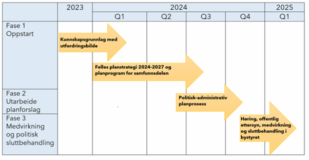 For at kommuneplanens samfunnsdel skal kunne fungere som et reelt styringsverktøy må den vedtas tidlig i bystyreperioden. Byrådet ønsker å ha en effektiv planprosess, der kommuneplanens samfunnsdel skal ferdigstilles første halvdel av 2025. Selv om planprosessen blir kort og effektiv, skal den sikre både politisk forankring og allmenn medvirkning.