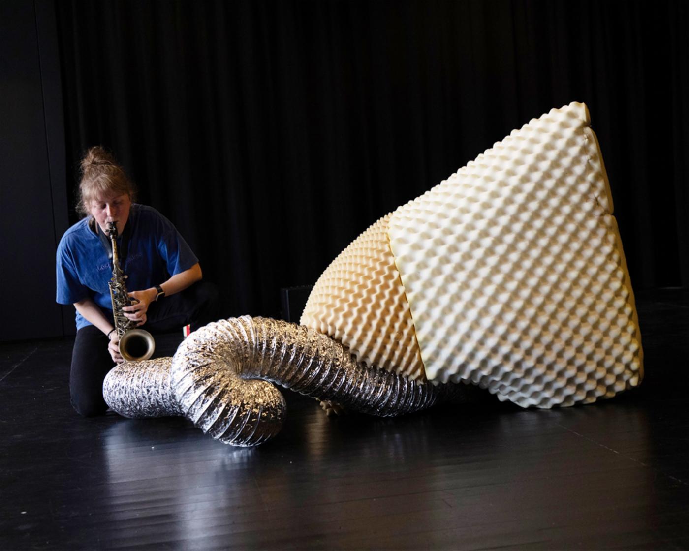 Vesenet kommer krypende og flytende inn døren og utover scenen. Ikke er det menneske, ei heller dyr – men kanskje en levende sølepytt, en mikroorganisme, en sky, eller en undervanns-skapning fra en annen planet? Det skifter ham, farge og struktur, etterlater frynser og fibrer, vakler og vibrerer, og transformerer seg i takt og i samspill med musikken.