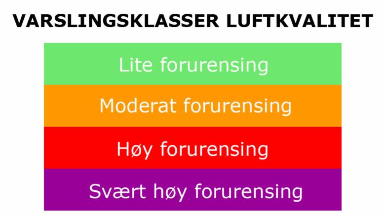 Hvor forurenset luften er, vises ved bruk av forurensningsklasser med fargekoder: