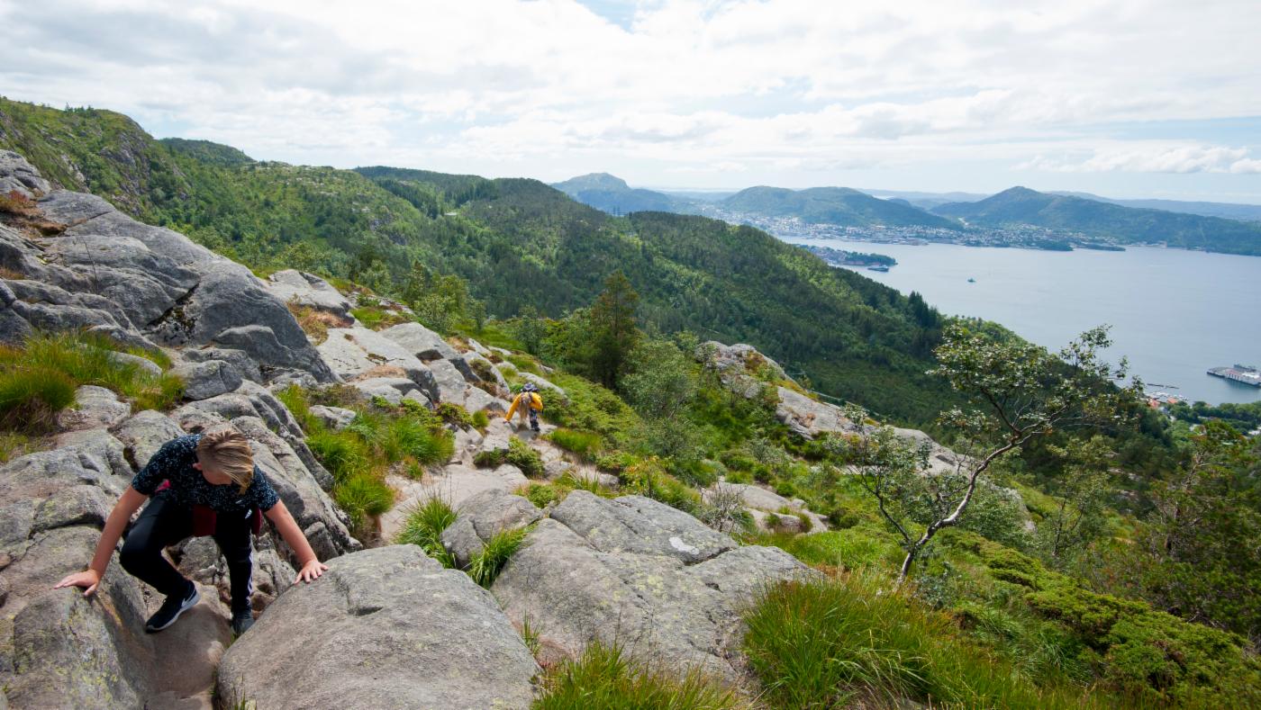 Cirka halvveis passerer du et vakkert skar, ved Lavet og Langediket, litt bratt ned før du går opp igjen. Og etter hvert stiger mastene på henholdsvis Rundemanen og Ulriken opp i horisonten. Da jeg var liten, spiste vi alltid ved det lille tjernet, men i dag sverger jeg til toppen av Rundemanen – helst i le av en hyttevegg. Utsikten over Bergen og Vidden, stillheten, steiner, kratt og små tjern, og den uendelige horisonten. Jeg blir aldri lei.