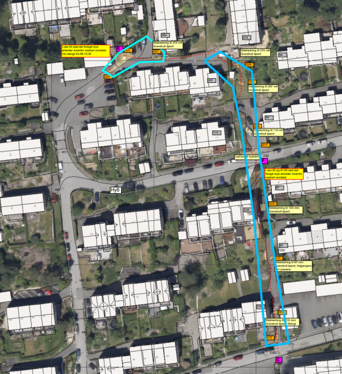 - I uke 40 skal vi trekke inn en vannledning mellom Einerhaugen 27A (pkt G20) - Brakeveien 21A (pkt C). Deretter skal denne koples til og sluttføres i uke 41 og 42. Det vil være litt dårlig fremkommelighet ved parkplass ved nr 5A.