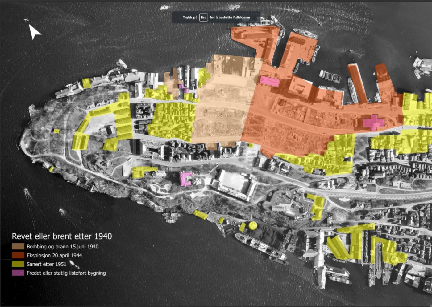 Kartet Byantikvaren har utarbeidet, gir et inntrykk av hvor store områder som ble påvirket av de nevnte krigshendelsene, og som gjennomgikk sanering i ti-årene etter krigen.