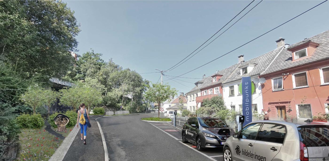 Plasser reservert til utslippsfrie delebiler, offentlige ladeplasser for naboer, i tillegg til sykkelparkering.