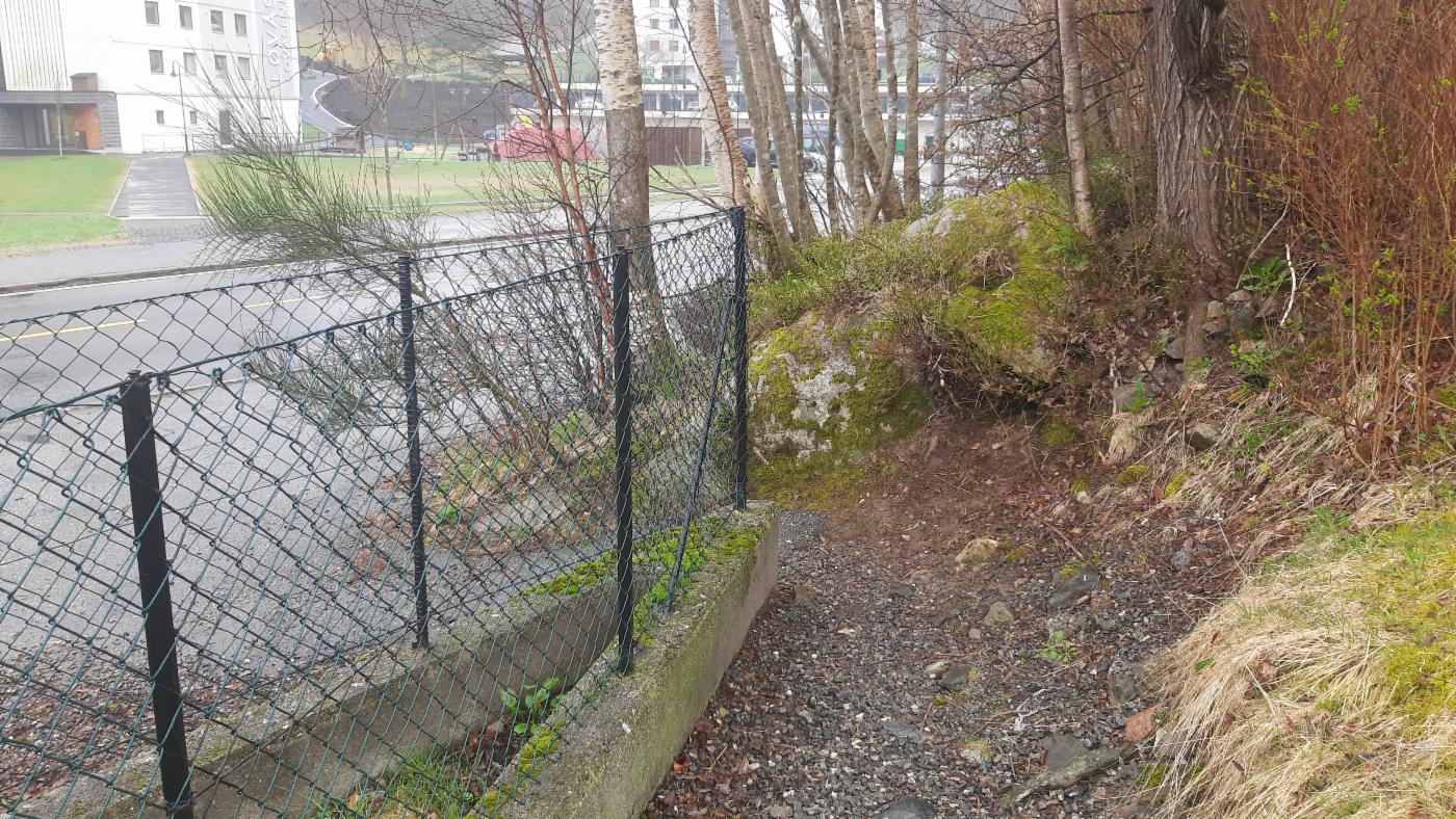 En svært smal gangsti med et ujevnt dekke som varierer mellom asfalt og grus. Dette er den eneste opparbeidede gangforbindelsen nordfra til bussholdeplassen “Lynghaug skole”. Veien har en lengde på rundt 35 meter, og høydeforskjellen er på 3 meter.