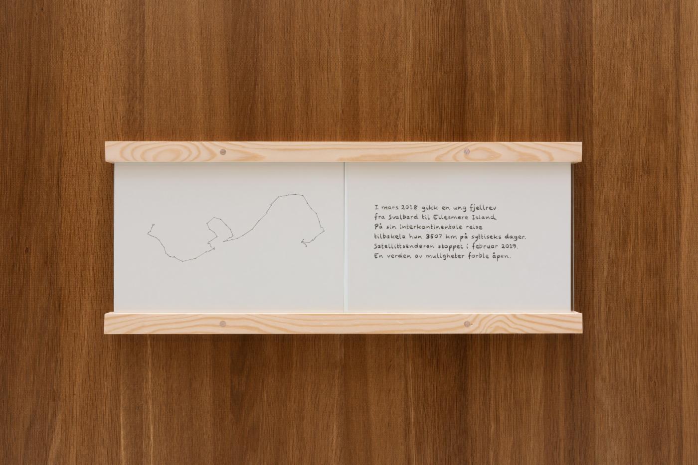 In a series of still images from a hand-drawn animation, Rojda’s artwork follows the journey of a young female Arctic fox across continents. Tracked by Norwegian scientists in 2018, the one-year-old fox travelled at great speed 3605 km across the polar ice - from Svalbard to Canada via Greenland - in a matter of 76 days before the signal stopped transmitting. In Rojda’s animation, the fox’s journey unfolds through a speculative memory system, blurring the boundaries between reality and imagination as she ventures while following stars, senses unseen creatures, and dreams of encounters yet to come--as well as what she has left behind. Due to its epic migration across vast icy landscapes, the Arctic fox becomes an unusual symbol of resilience, determination and mobility.