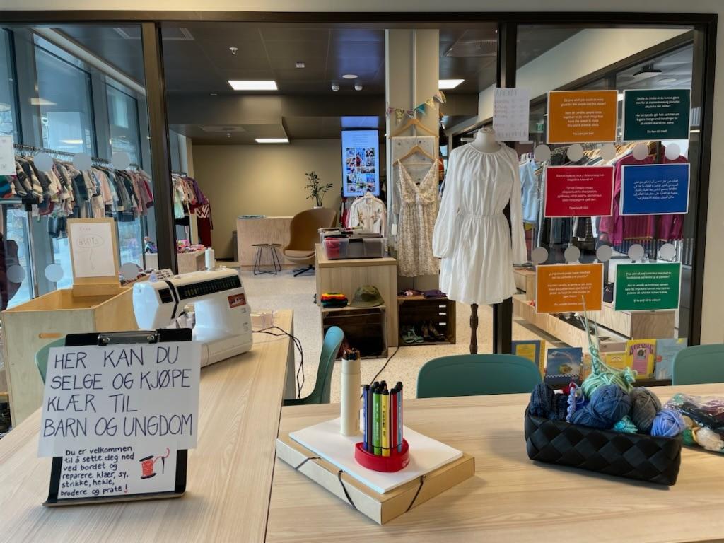 Nabolagsbutikken på BIS drives av Bærekraftige liv Landås, og her finner du brukte barne- og voksenklær til en rimelig pris. Det er mulig for privatpersoner å selge klær gjennom butikken, en enkel og bærekraftig måte å gi plagg nytt liv på. Vi har flere symaskiner tilgjengelig, enten du vil reparere klær eller sy noe nytt. I tillegg har vi garn, strikkepinner og utstyr til hekling.
