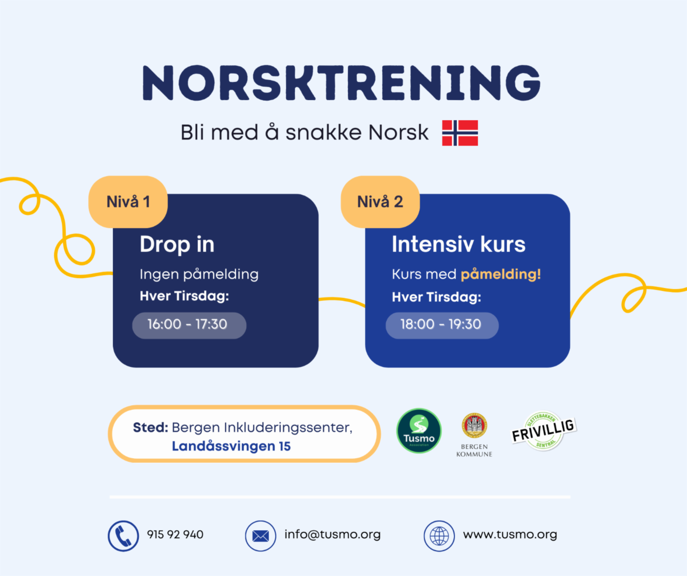 Målgruppen for norsktreningen er innbyggere i Bergen kommune med innvandrer- og flyktningbakgrunn som ønsker å styrke sine norskkunnskaper og digitale ferdigheter. Tilbudet er tilpasset ulike ferdighetsnivåer og inkluderer lese-, skrive- og muntlig trening i norsk, samt en innføring i norsk kultur. Prosjektet er finansiert av Bergen kommune. Påmelding på e-post: info@tusmo.org eller telefon: 91 59 29 40. For å sikre god oversikt i forbindelse med servering er det viktig at påmelding skjer innen mandag (dagen før kursdagen). Se også Tusmo sine nettsider for mer informasjon.