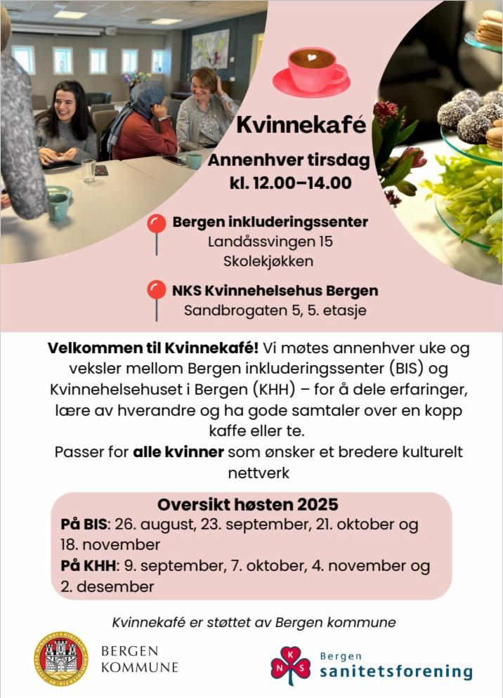 🫶 Kvinnekafé passer for alle kvinner som ønsker et bredere kulturelt nettverk. Det er helt gratis - bare å komme! Det blir enkel servering med kaffe, te og noe å spise. Du er selvsagt velkommen til å ta med hjemmelaget kake eller noe annet å dele! Kvinnekafé er en sosial møteplass for kvinner på tvers av bakgrunn, alder og kultur. Vi møtes annenhver uke for å bygge nettverk, ha gode samtaler og lære av hverandre. For mer informasjon se Bergen sanitetsforening: Kvinnekafé (BIS og KHH) - Bergen Sanitetsforening