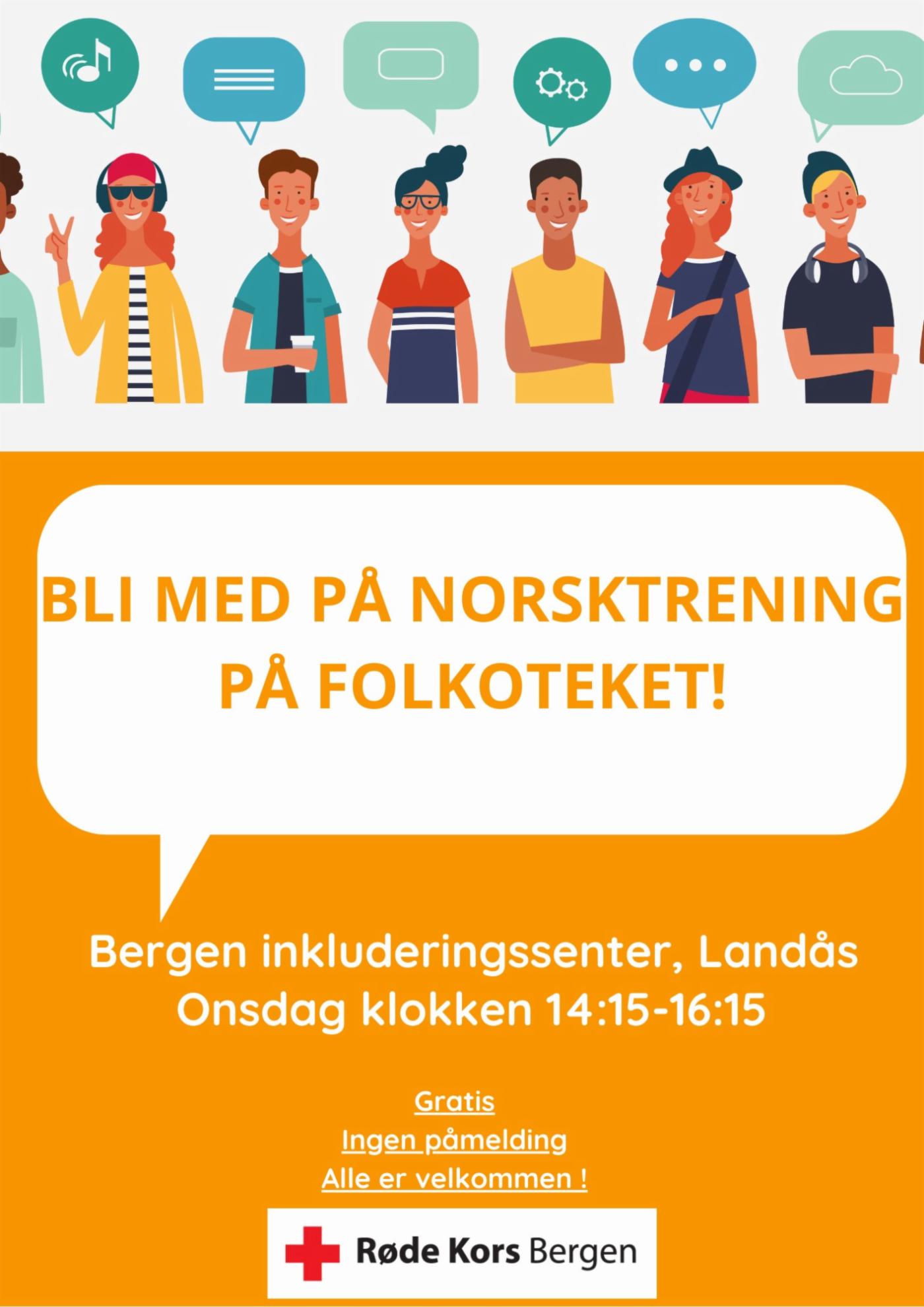 Norsktrening er en uformell sosial møteplass som er åpen for alle over 18 år som ønsker å øve seg på å snakke norsk. Deltakerne får mulighet til å praktisere norsk muntlig og øve på dagligtale med norsktalende frivillige. Norsktreningen blir arrangert i Folkoteket (biblioteket), det er gratis, åpent for alle nivåer og du trenger ikke registrere deg.