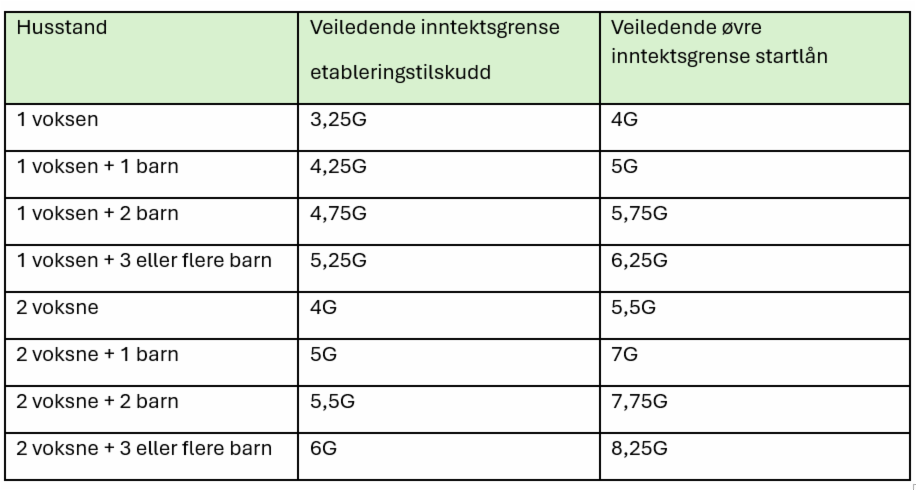 Bergen kommunes veiledende inntektsgrenser for startlån og tilskudd.