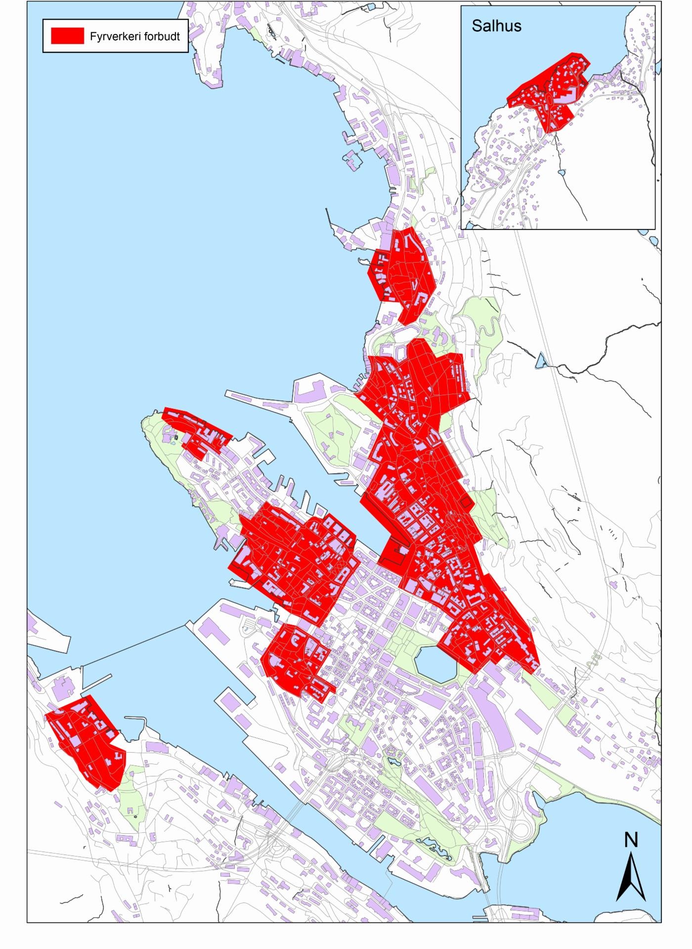 I 2016 vedtok bystyret i Bergen en ny lokal forskrift som innebærer totalforbud mot bruk av fyrverkeri i og i nærheten av de tette trehusområdene i Bergen. All bruk av fyrverkeri er forbudt innenfor områdene som er merket med rødt på kartet. Forbudet gjelder hele året.