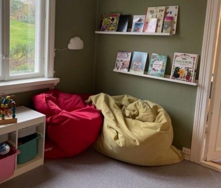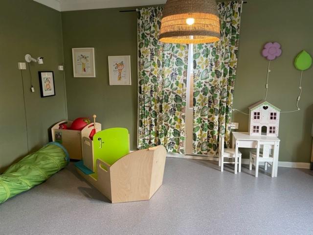 På krisesenteret har vi lekerom for barna og ungdomsrom for de litt eldre, med tv og playstation. Vi har også et fint uteområde med lekeplass.