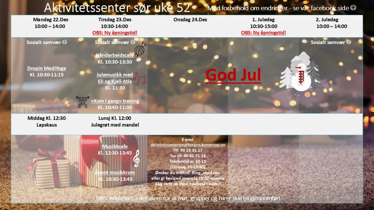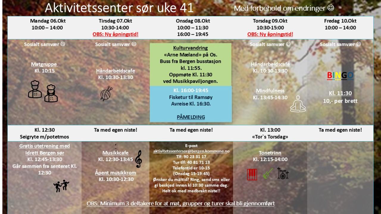 Ønsker du mer informasjon enn du finner her, så ta kontakt med oss på Aktivitetssenteret Bergen sør.