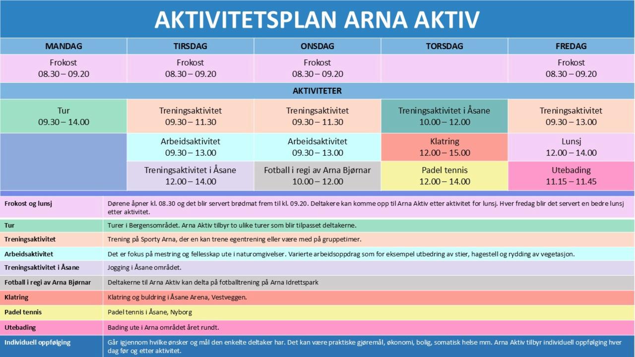 Arna Aktiv er et rehabiliteringstilbud for personer med rusutfordringer i Bergen kommune. Gjennom fysisk aktivitet og et trygt fellesskap fremmer vi helse, mestring og livsglede. Målet er å hjelpe deltakerne videre mot deltakelse i samfunnet – enten gjennom arbeid, skole eller frivillig arbeid.