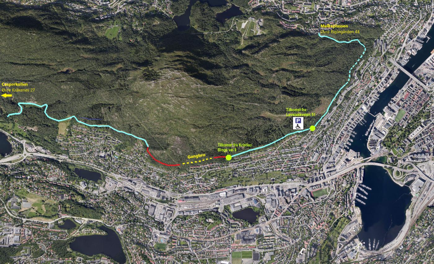 Om du kommer med bybanen fra sentrum er nærmeste stoppet Danmarksplass. Herfra tar det cirka 15 minutter opp til Løvstakkveien og Løvstien.