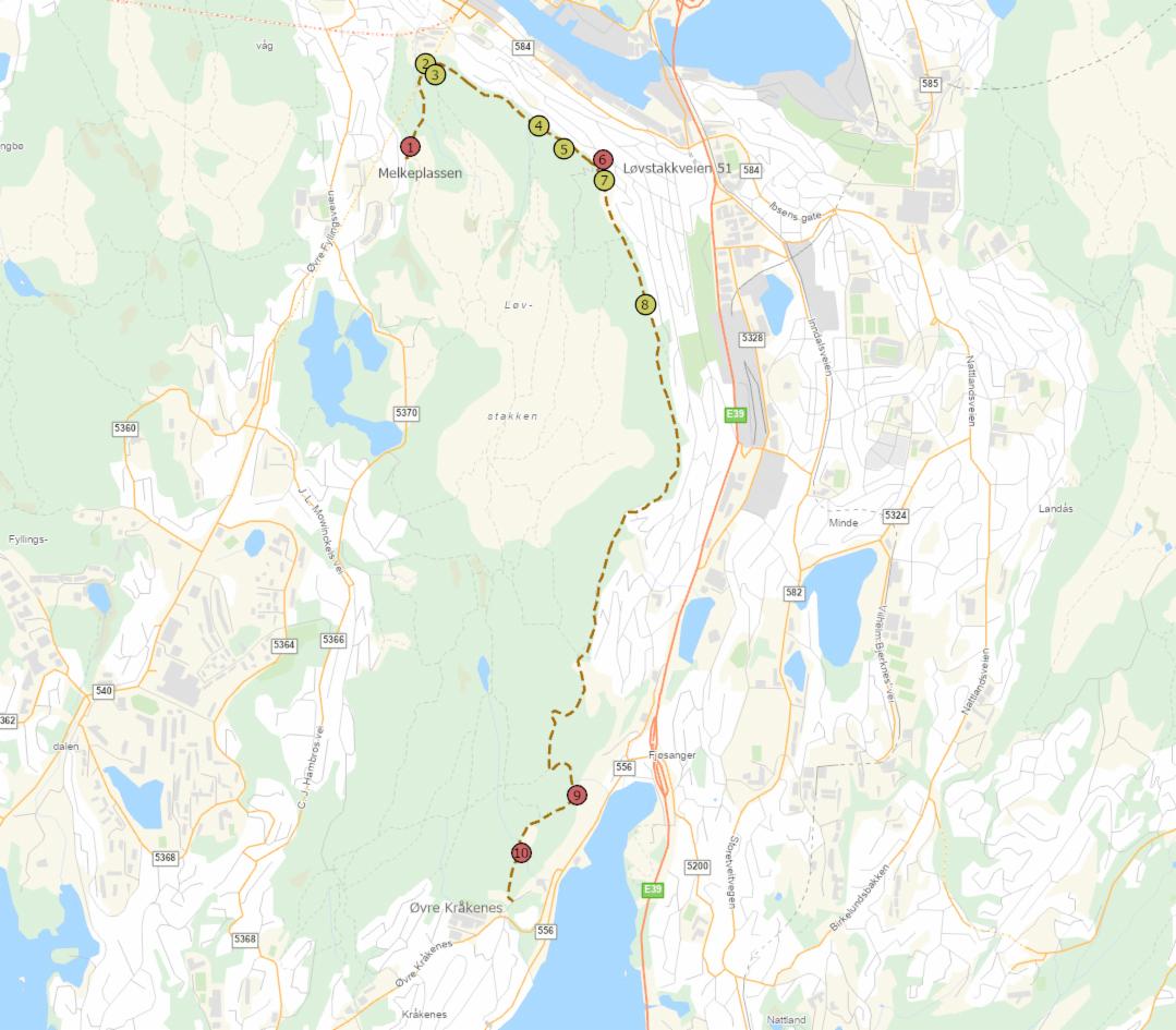 Kart over Løvstien som viser hvor du kan kaste bosset ditt. Rød prikk viser nedgravde avfallscontainere på 3000- 5000 liter. Grønn prikk viser avfallsbeholdere på 70 liter .