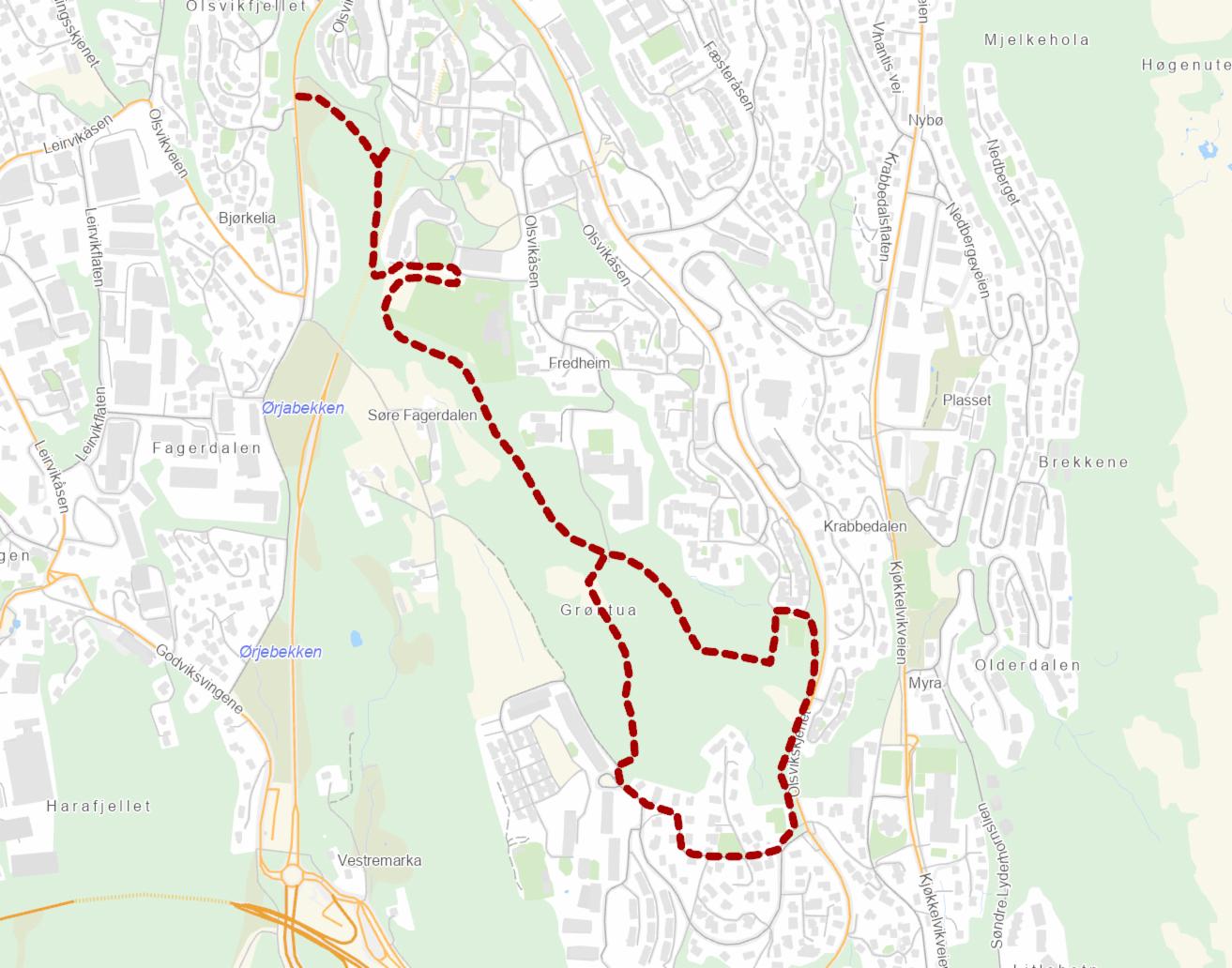 Tursti over Grøntua med tilkomst fra flere steder i Olsvik. Fra toppen av Grøntua får du en nydelig utsikt vestover. Turveien går også via Brønndalen friområde og Olsvik sykkel- og nærmiljøanlegg. Turen går for det meste på sti, med et parti på asfalt.