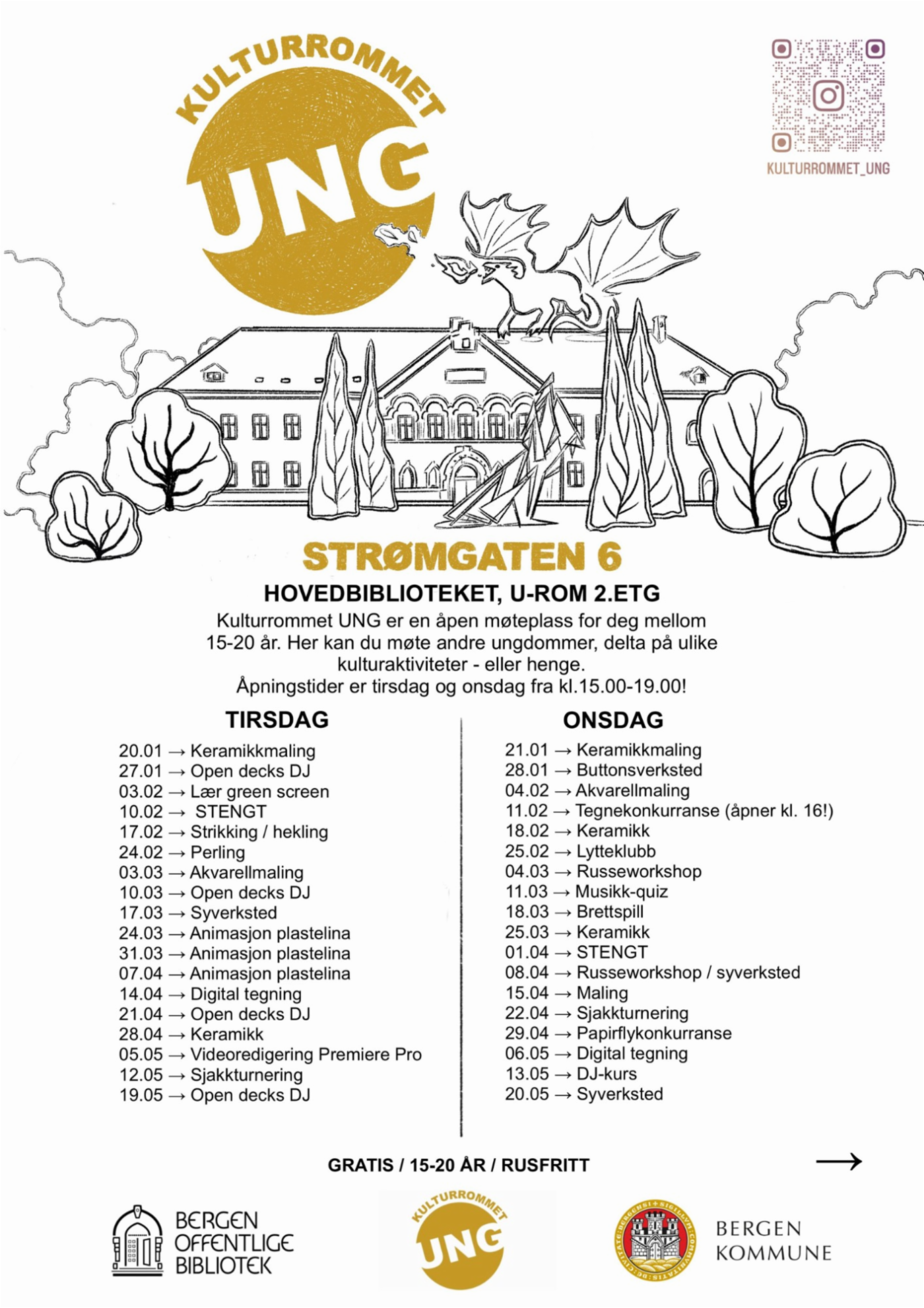 Kulturrommet Ung er en åpen møteplass i regi av Etat for bibliotek og kultur for ungdom fra 9. trinn til 20 år. På Kulturrommet Ung er det mulig å delta på ulike kulturaktiviteter. Velkommen!