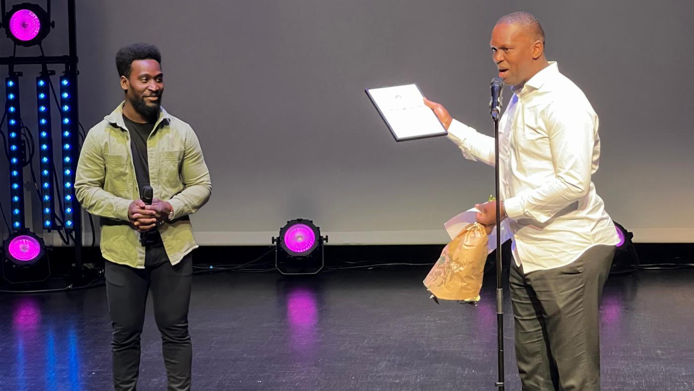 Cidi Nzita (til venstre) mottok prisen fra direktør for Kulturetaten Vincent Mrimba.