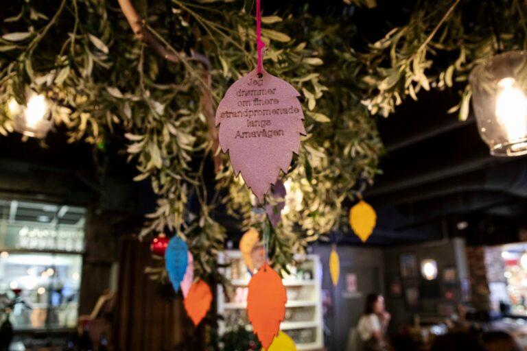 I stedet for å transportere et tre fra utsiden, stilte Alwynne spørsmålet: Det er allerede så mange fantastiske trær i Arna, hvorfor ikke feire dem og dekorere trærne med drømmer fra lokalbefolkningen?