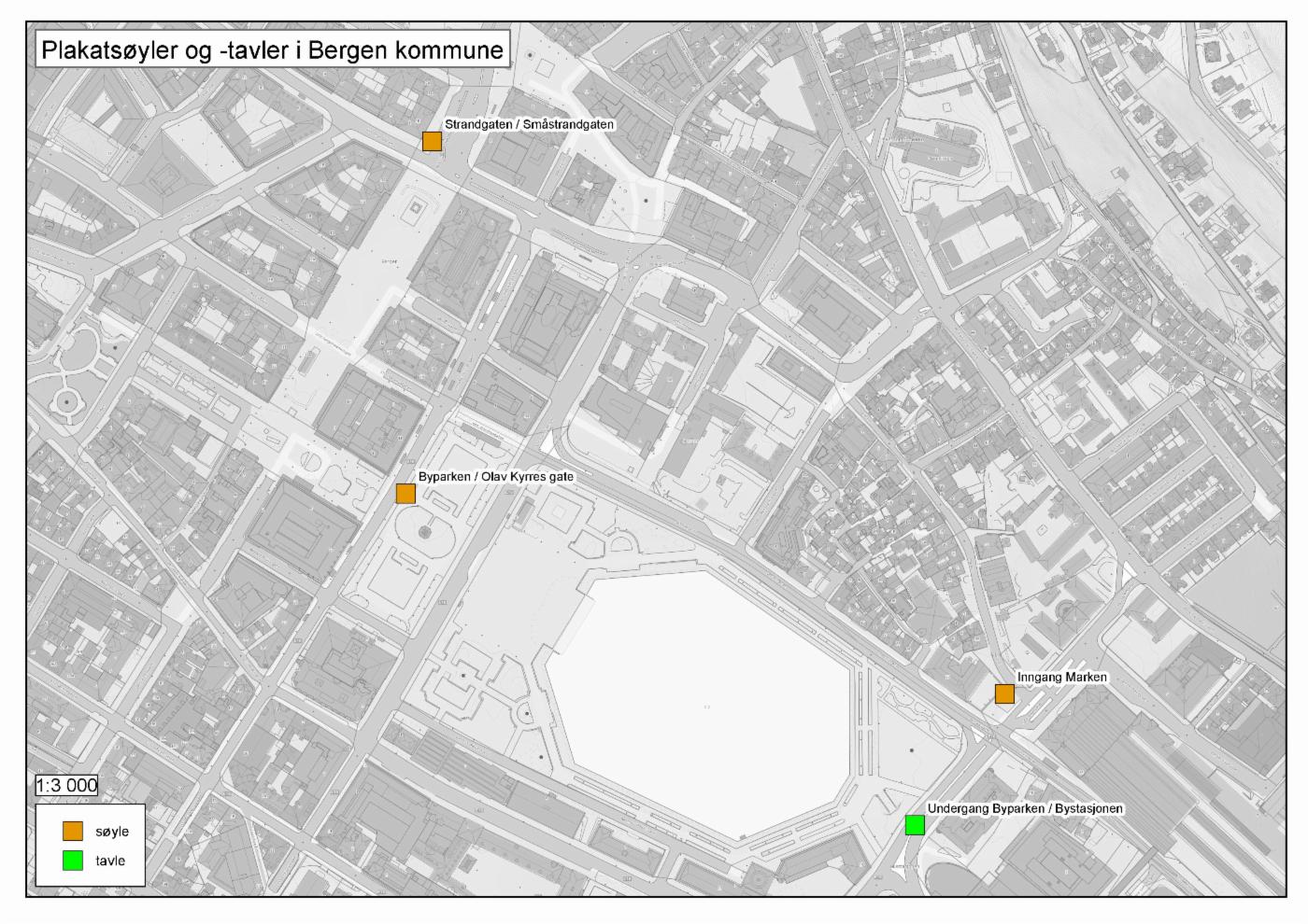 Du kan henge opp plakater på plakatsøyler og plakatvegger som er godkjent av Bergen kommune. Se oversikt over godkjente steder for plakater her.
