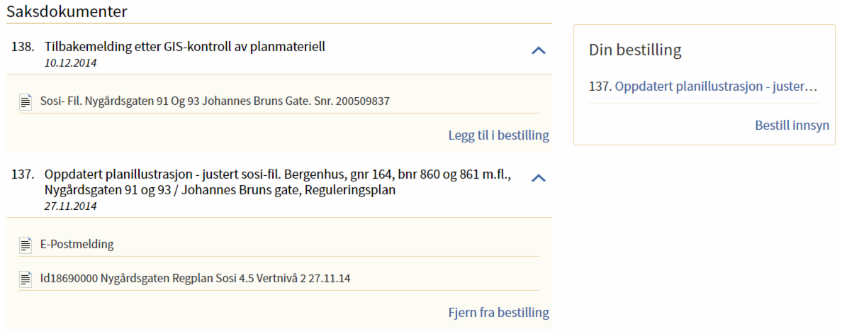 For å be om innsyn i dokumenter, velger du «Legg til i bestilling». Bestillingen inkluderer da alle filer som tilhører det aktuelle dokumentnummeret. Dersom du ønsker det, kan du legge til flere dokumenter, før du ber om innsyn ved hjelp av valget «Bestill innsyn». Se eksempel nedenfor.