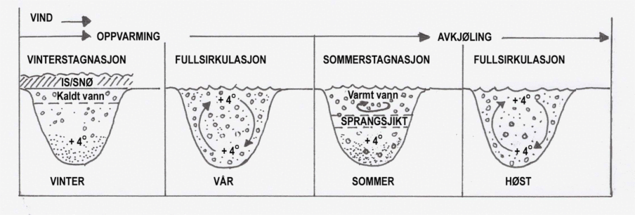 Vann har en spesiell egenskap ved at det er tyngst ved 4 grader. Vann som er varmere eller kaldere enn 4 grader er dermed lettere og vil legge seg over dette vannet.