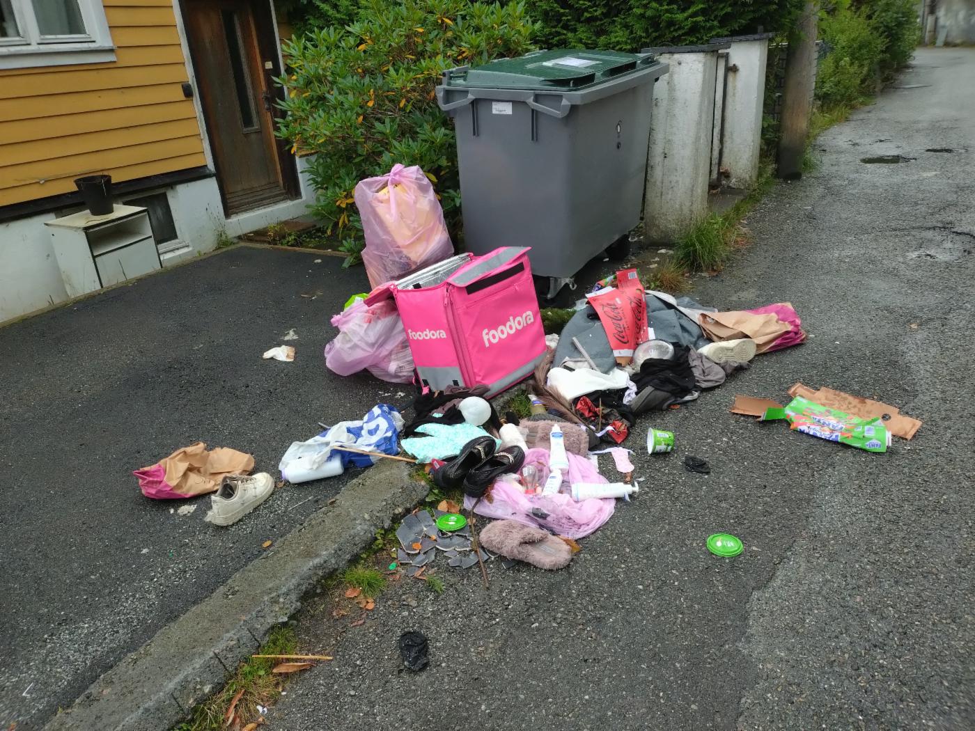 Foto av søppel som flyter utover fortau ved et søppelspann.