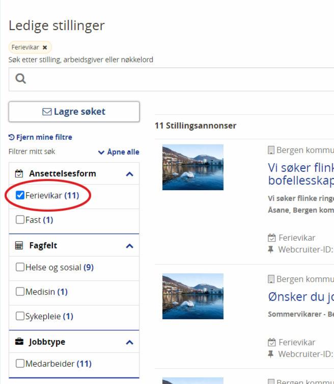 Hvis du er over 18 år og er på jakt etter sommerjobb hos oss, følg med på utlyste stillinger her i Webcruiter. Skriv søkeord “sommerjobb”, "sommervikar" eller “ferievikar”, eller sorter ved hjelp av filteret.