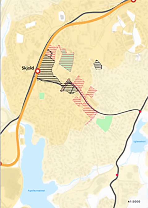 Kjerneområdet for stedsanalysen på Skjold, ligger nordøst for Apeltunvatnet, mellom Fanavegen, Apeltunvegen og Skjoldhøgda. Området er angitt som byfortettingssone og ytre fortettingsone i kommuneplanens arealdel (KPA 2018), med kort avstand til sentrumskjernen ved Lagunen. Området har gangavstand til viktige funksjoner som bybane, buss, butikk, barnehager og skoler.