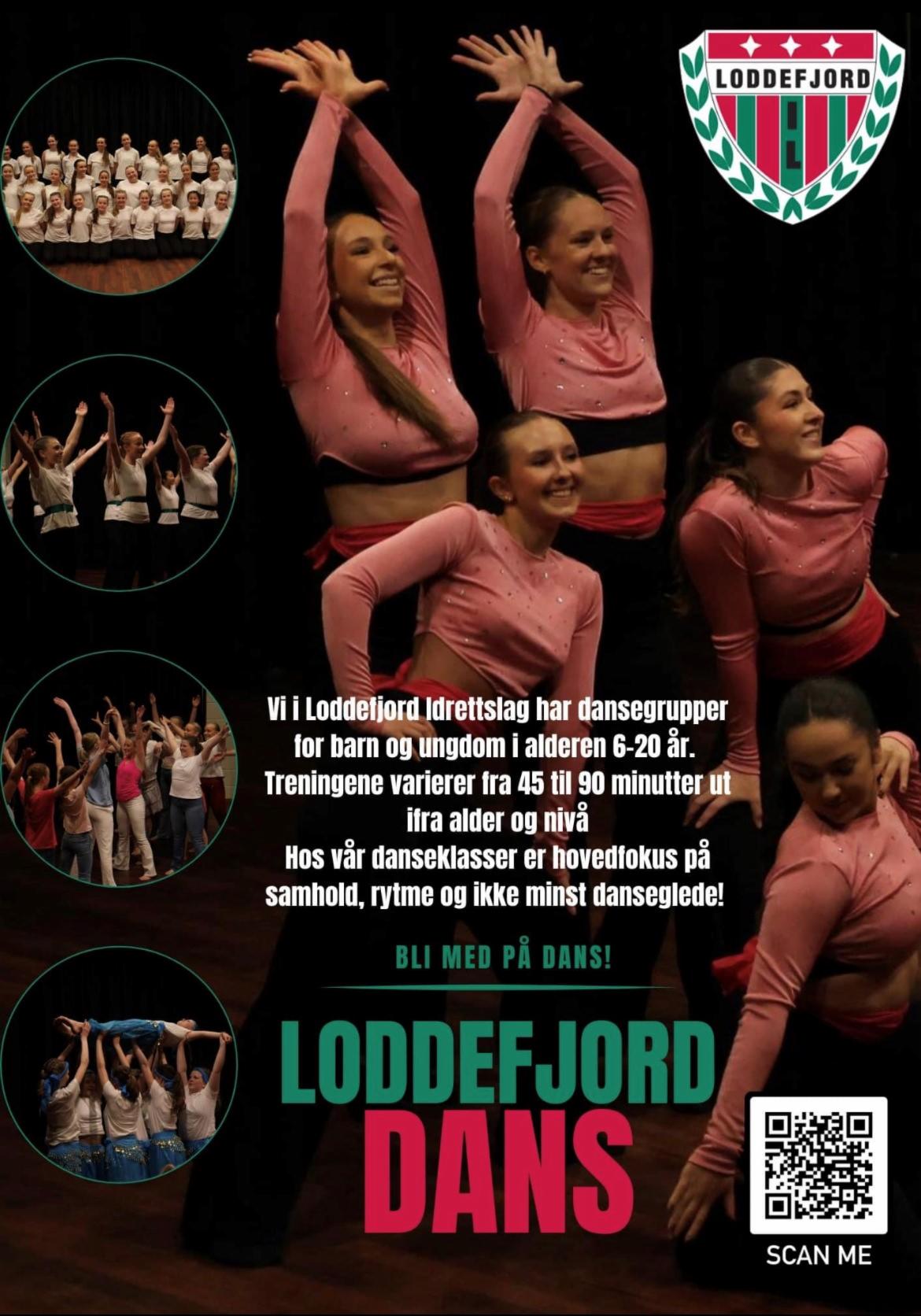 Loddefjord IL har dansegrupper for barn og ungdom i alderen 6-20 år. Påmelding via QR-koden nederst i bildet.